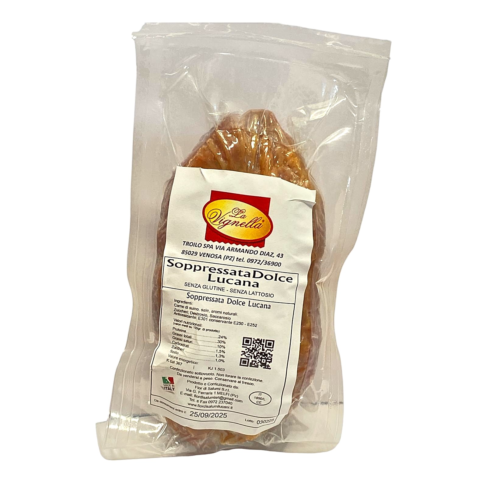 La Soppressata Dolce Lucana è un’eccellenza della tradizione gastronomica della Basilicata, realizzata con carne suina di alta qualità e condita con ingredienti semplici ma autentici. Il suo sapore delicato e la consistenza morbida la rendono perfetta per chi ama i salumi dal gusto equilibrato e genuino.
